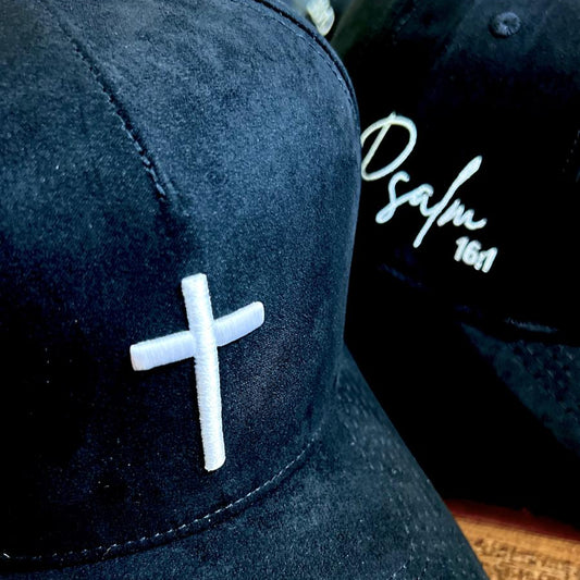 Premium Suede | Gamuza 5-Panel Hat – Cross & Psalm 16:1 Embroidery